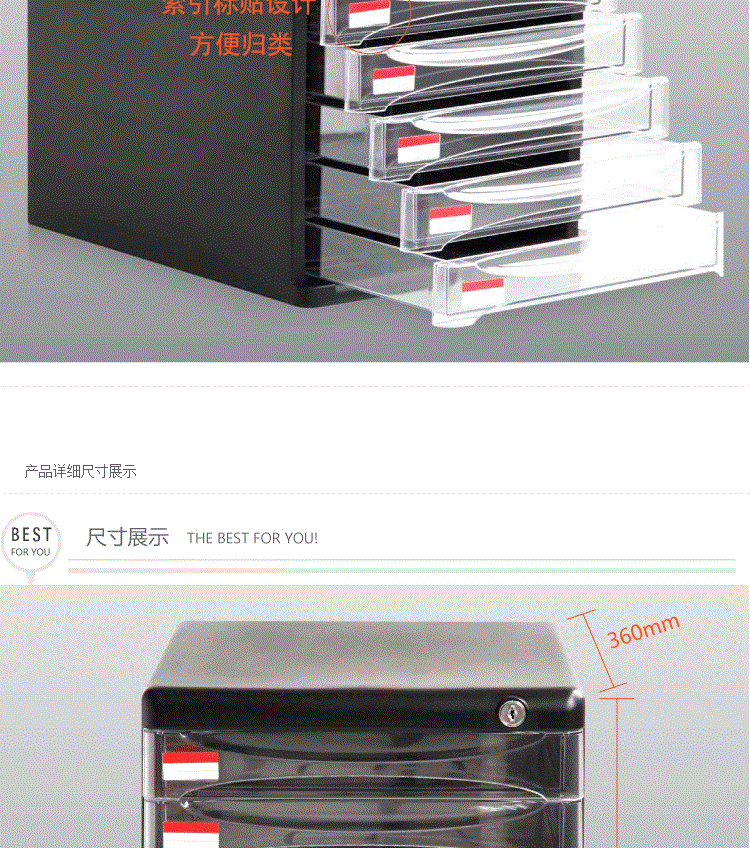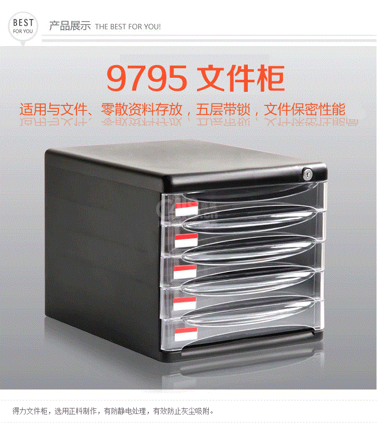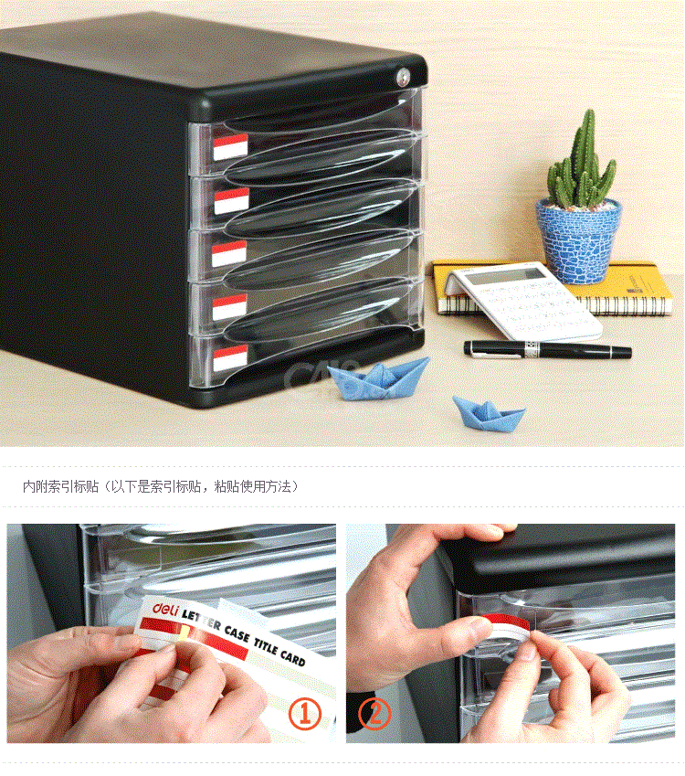 “deli/得力”No.9795 文件柜 單個裝(黑色5層帶鎖手拉桌面帶索引標簽抽屜資料收納柜學科試卷分類)
